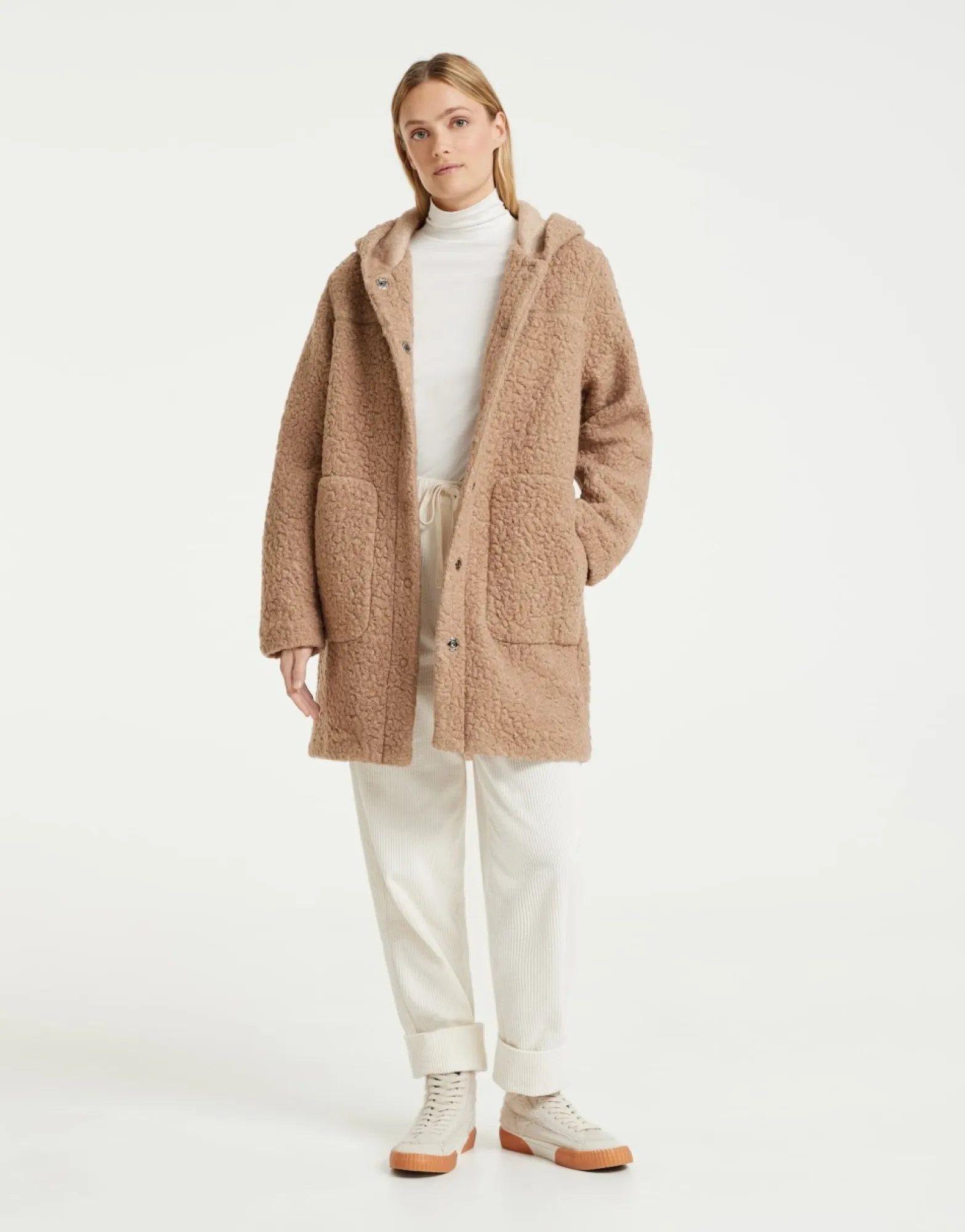 De Jas Is Gemaakt Van Een Zachte Wolmix En Heeft Een Modieuze Teddybontlook. De Lange, Losse Pasvorm Krijgt Een Sportief En Functioneel Detail Door De Capuchon. Grote Zakken Sieren De Voorkant Van De Jas.