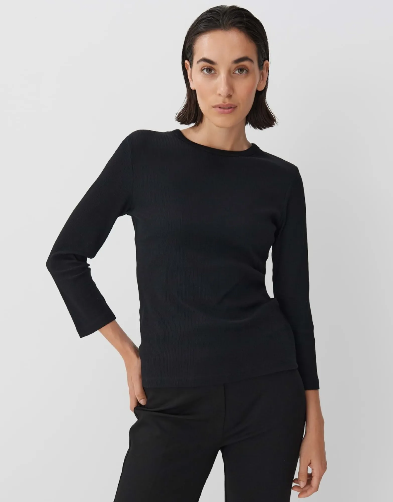 Het Shirt Gemaakt Van Een Hoogwaardige Bci Cotton Mix Leeft Van Een Fijne Rib Gespeeld Over Zachte Jersey. De Hoge Ronde Halslijn Oogt Elegant En Vrouwelijk Tegelijk.