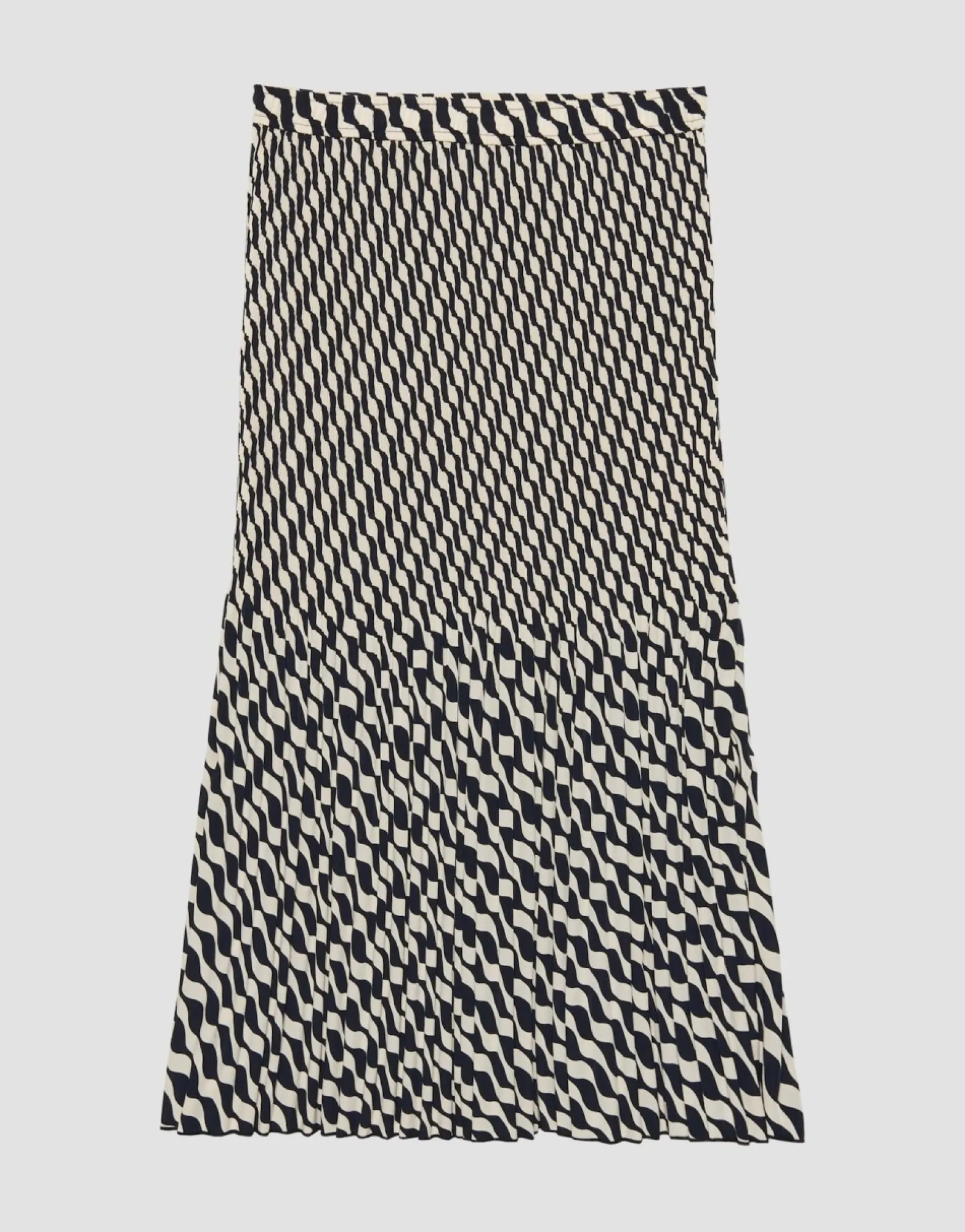 De Plooirok Van Gerecycled Polyester Speelt Met Een Mooie Print Over Kleine En Grote Plooien. Het Afwijkende Plooipatroon Maakt De Pasvorm Smal Tot Op De Knie En Vervolgens Uitlopend.