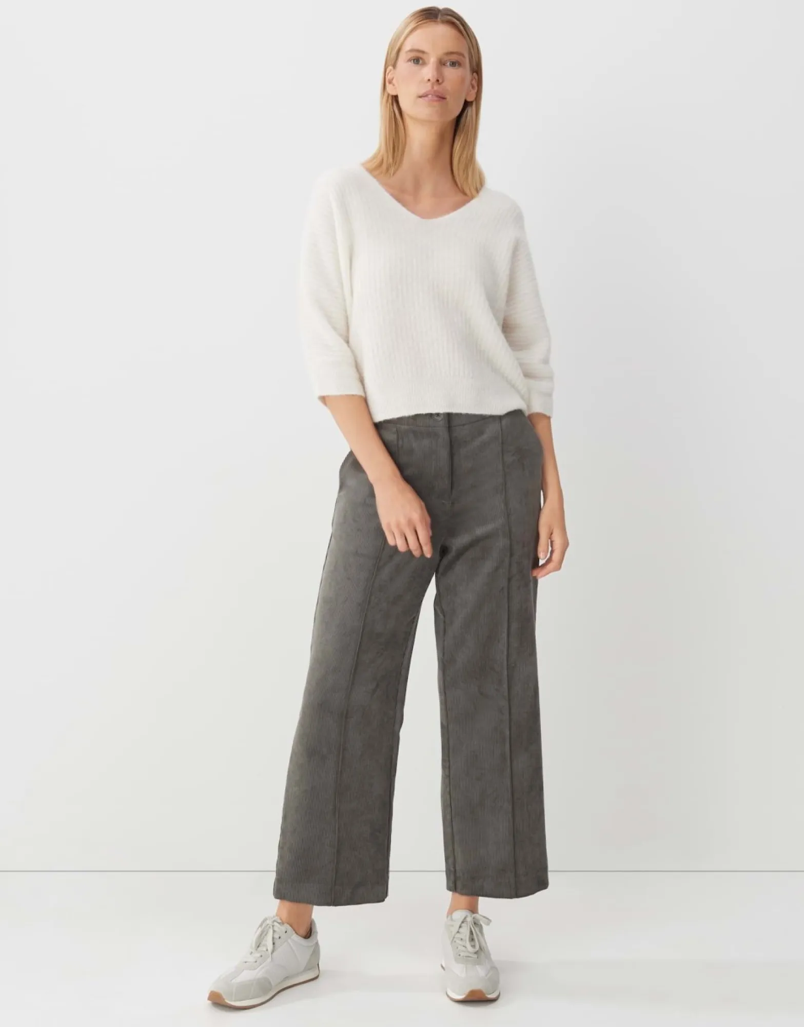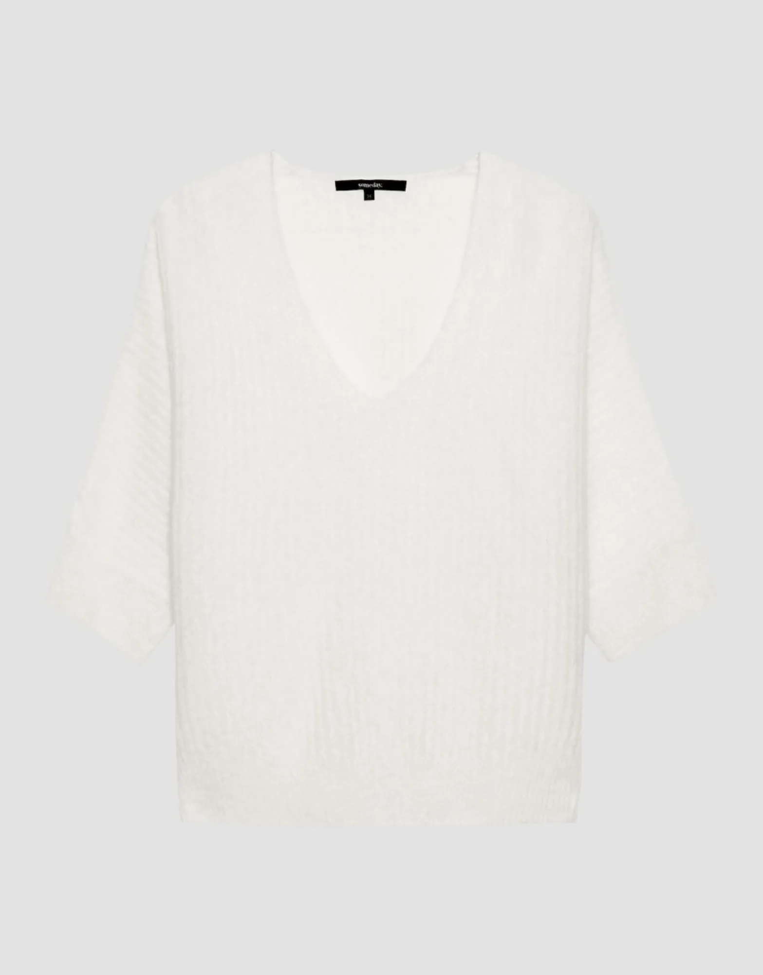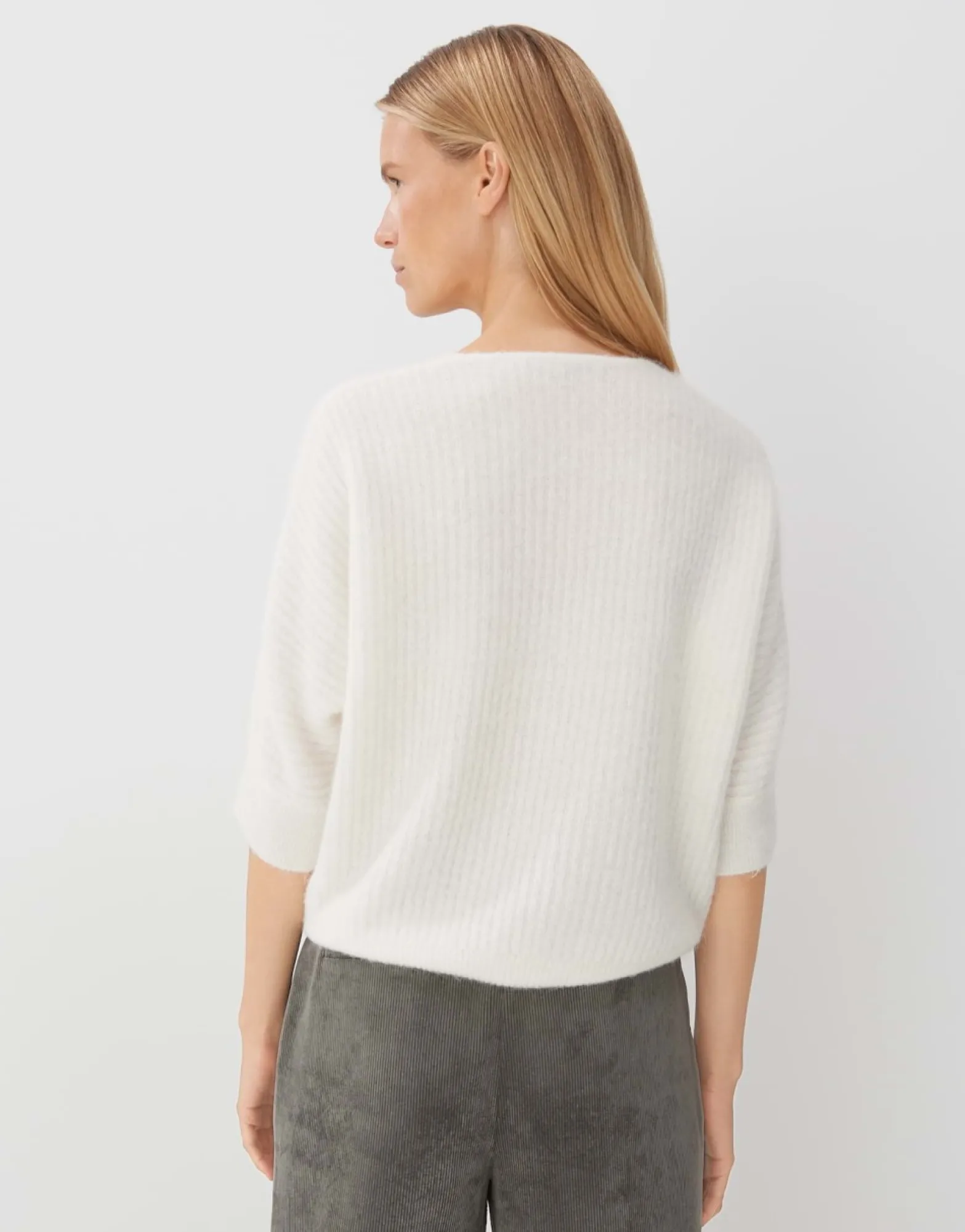 De Gebreide Trui Leeft Van Een Donzig Oppervlak En Een Prachtige Geribde Look. De Overlappende Vleermuismouw Loopt Direct Over In Het Losse Lijfje.