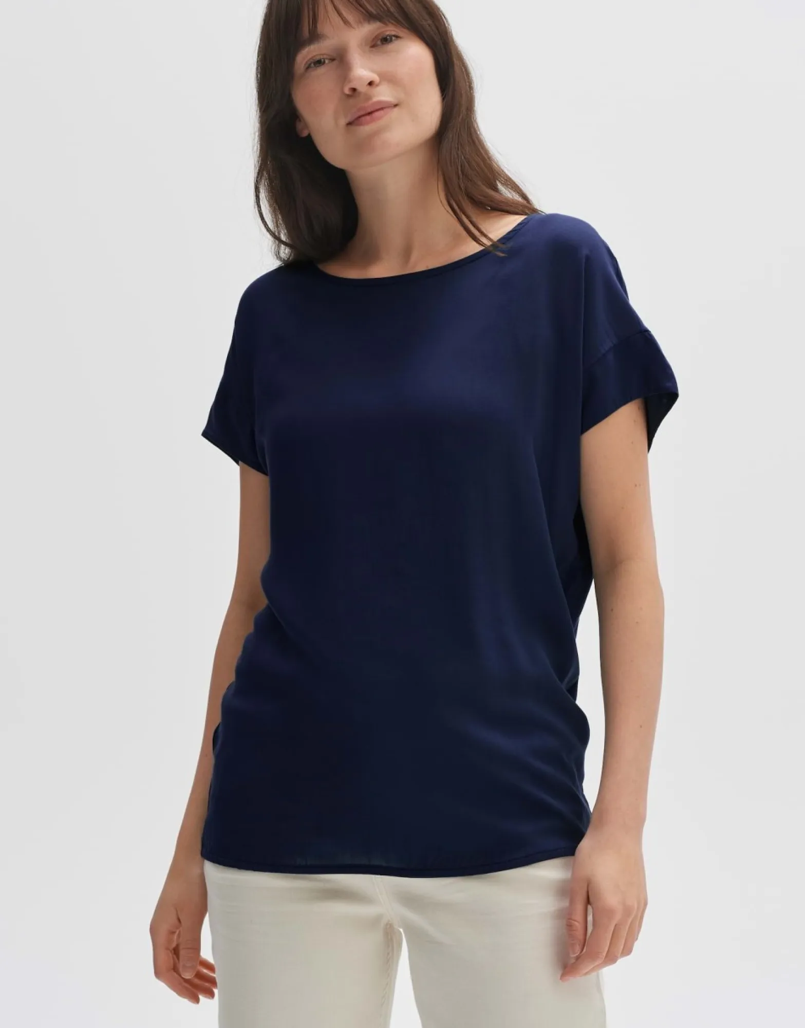 Dit T-Shirt Van Een Materiaalmix Van Ecovero™ Viscose Voelt Bijzonder Zacht Aan Op De Huid. Op De Rug Is Een Diep Schouderstuk Aangebracht. De Zoom Is Afgerond En Kan Los Over Een Broek Of Ingestopt Worden Gedragen.