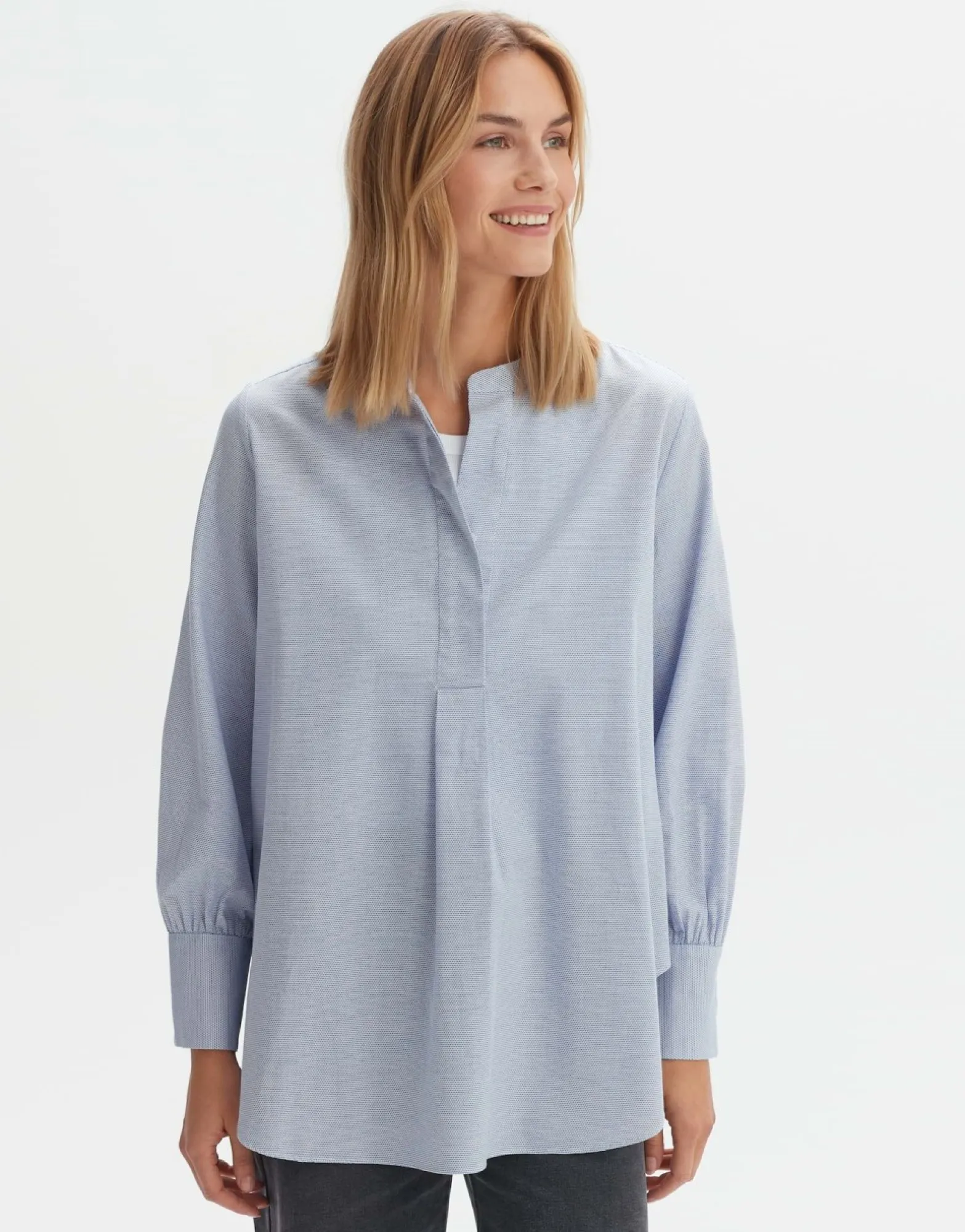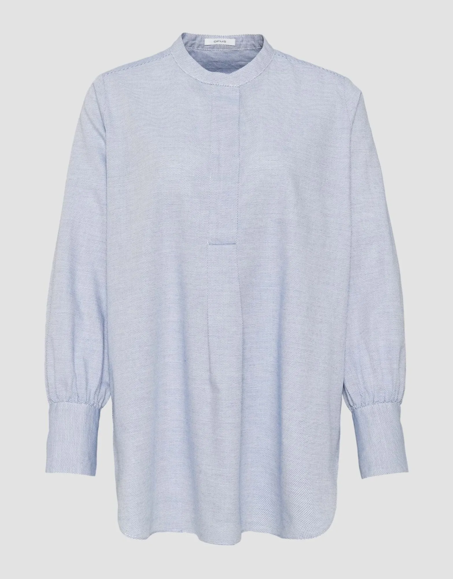 De Blouse Is Gemaakt Van Bci-Katoen Van Hoge Kwaliteit En Krijgt Een Pittige Uitstraling Door Het Materiaal En De Kleine Structuur. De Opstaande Kraag Gaat Over In Een Korte Knoopsluiting En Tenslotte In Een Plooi. Het Lange Silhouet Eindigt Met Een…