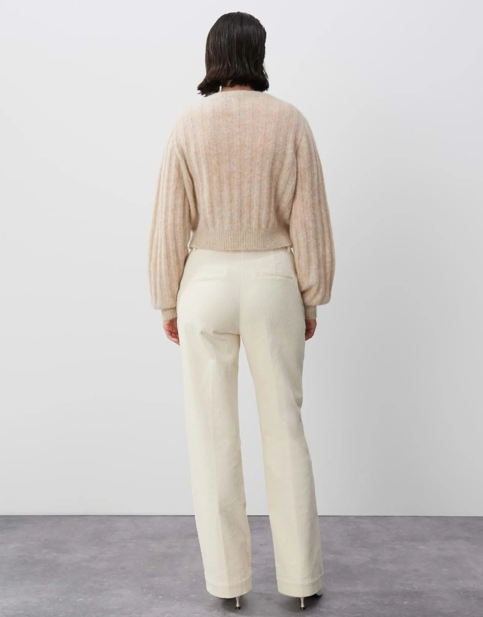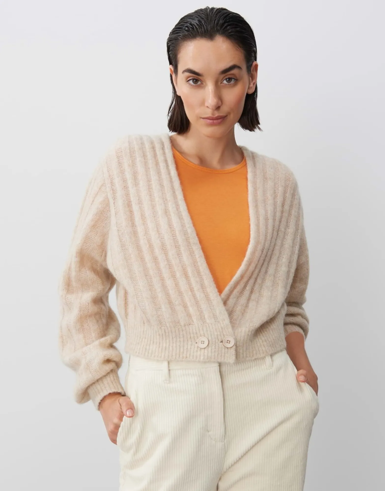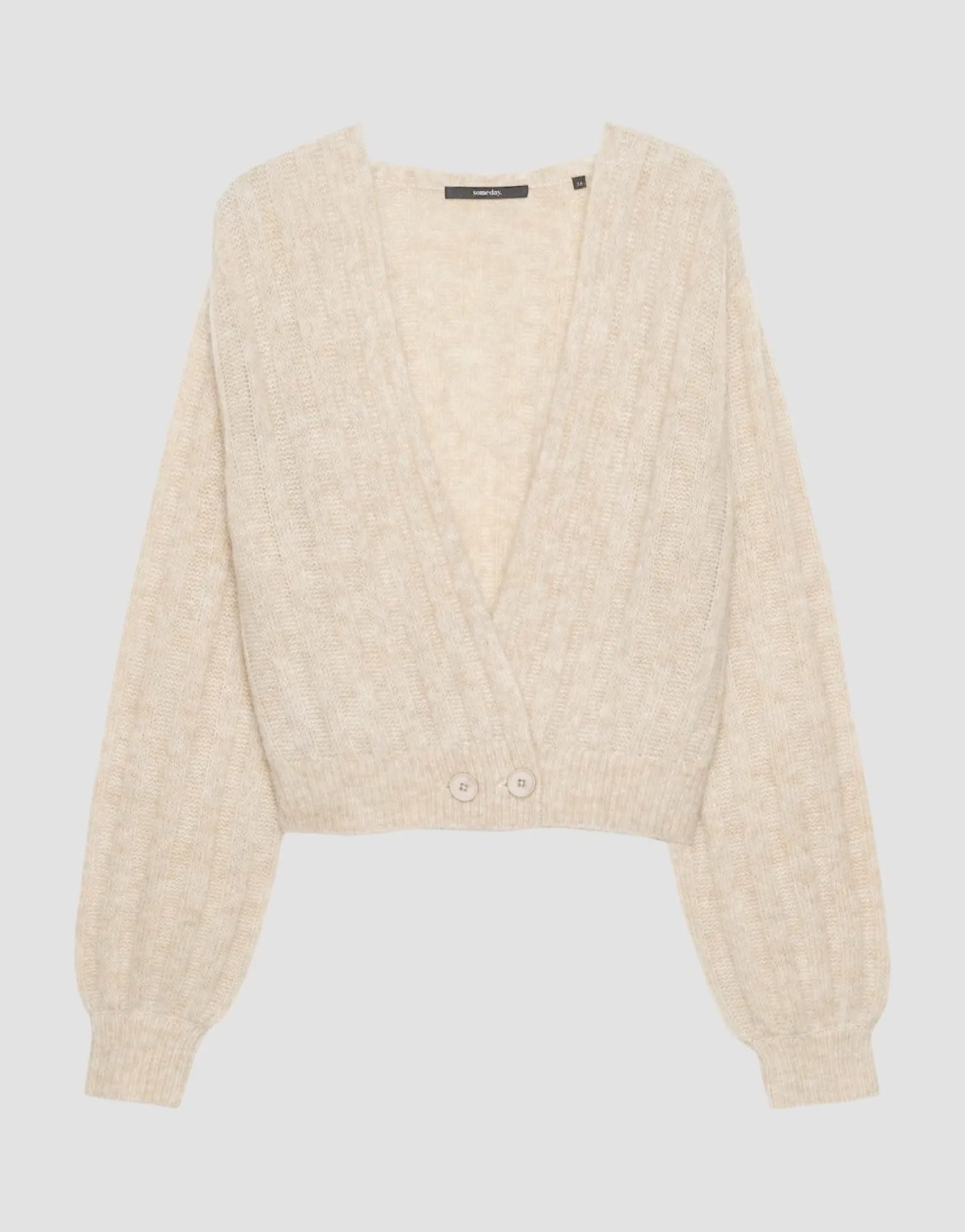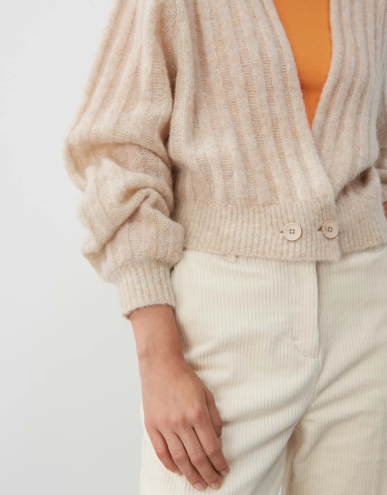 Dit Vest Is Gemaakt Van Een Pluizige Wolmix En Maakt Indruk Met Een Geraffineerd Wikkeleffect Dat Aan De Voorkant Wordt Vastgezet Met Een Dubbele Rij Knopen. De Grote Ribboorden Dragen Bij Aan De Dynamische Look.