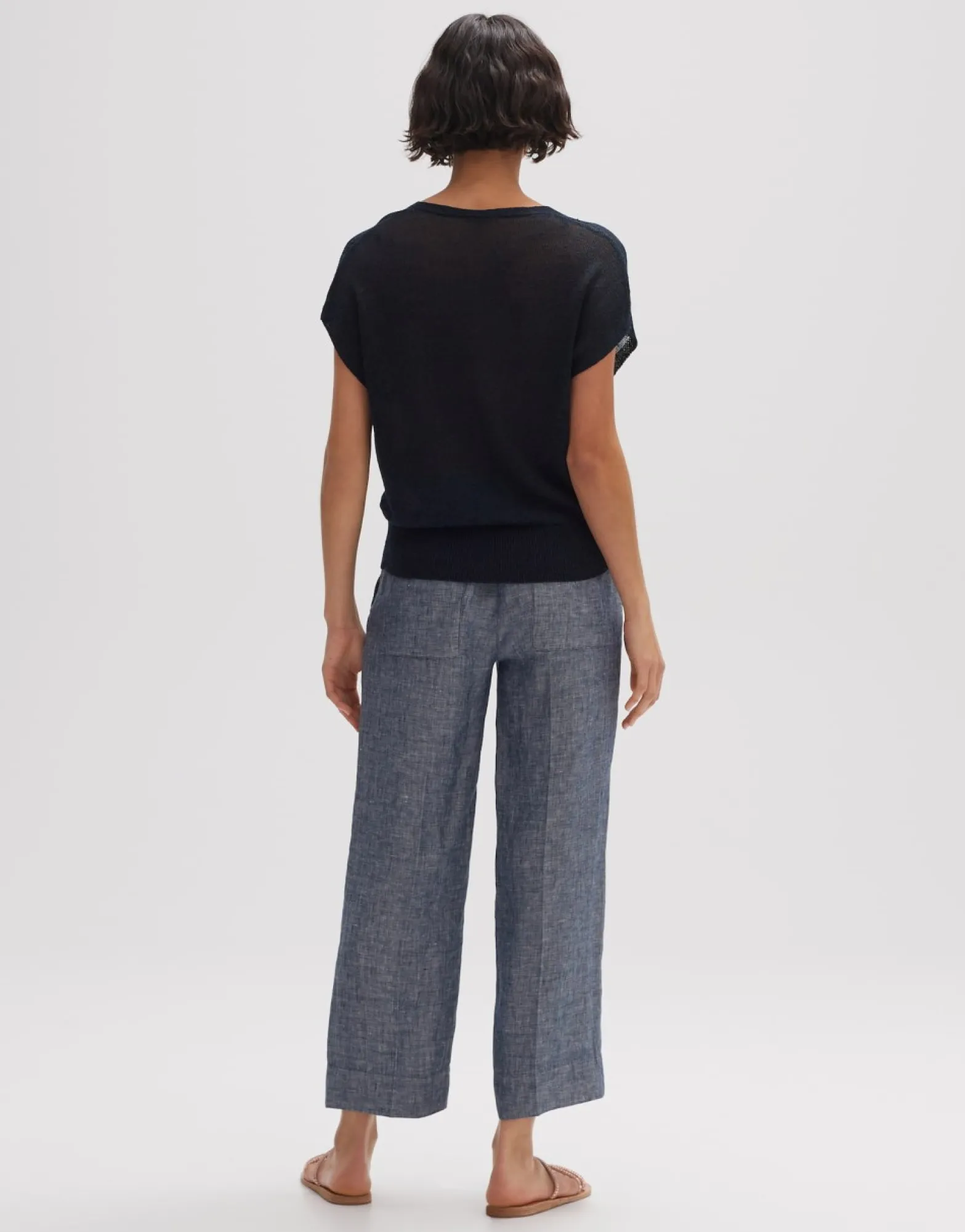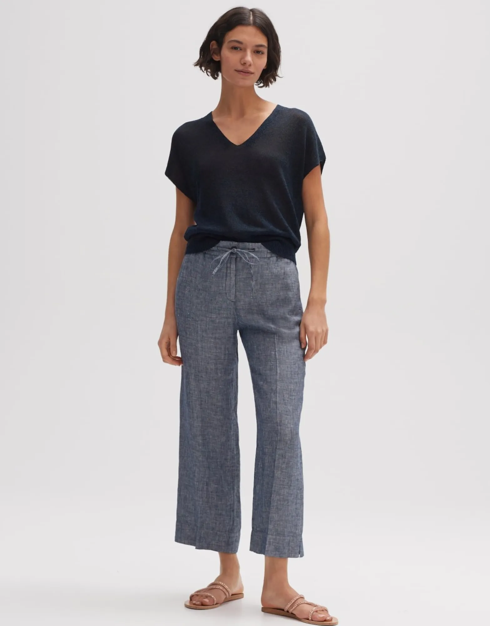 Het Gebreide Shirt In Een Linnen-Viscosemix Krijgt Een Zomerse Transparantie Door De Losjes Gebreide Steek. De Diepe V-Hals Heeft Een Vrouwelijk Effect, Terwijl De Brede Tailleband De Losse Vorm Losjes Laat Vallen.
