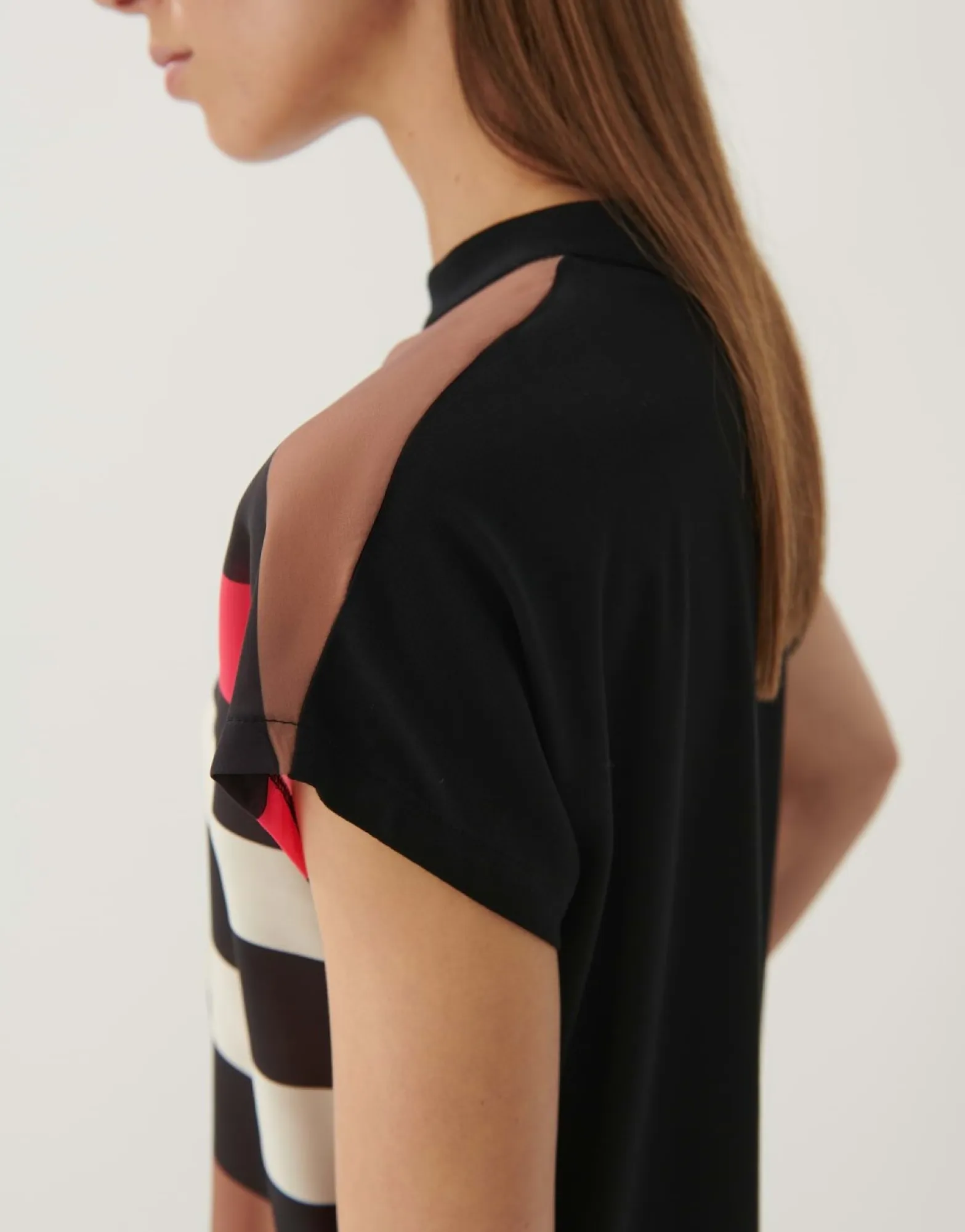 Dit Shirt Met Print Is Gemaakt Van Een Mix Van Materialen, Met Een Glinsterende Blousestof Aan De Voorkant En Een Ecovero™ Viscosemix Aan De Achterkant. De Nadruk Ligt Op De Print Van Strepen En Kleurblokken. De Opstaande Kraag Maakt Het Shirt Elega…
