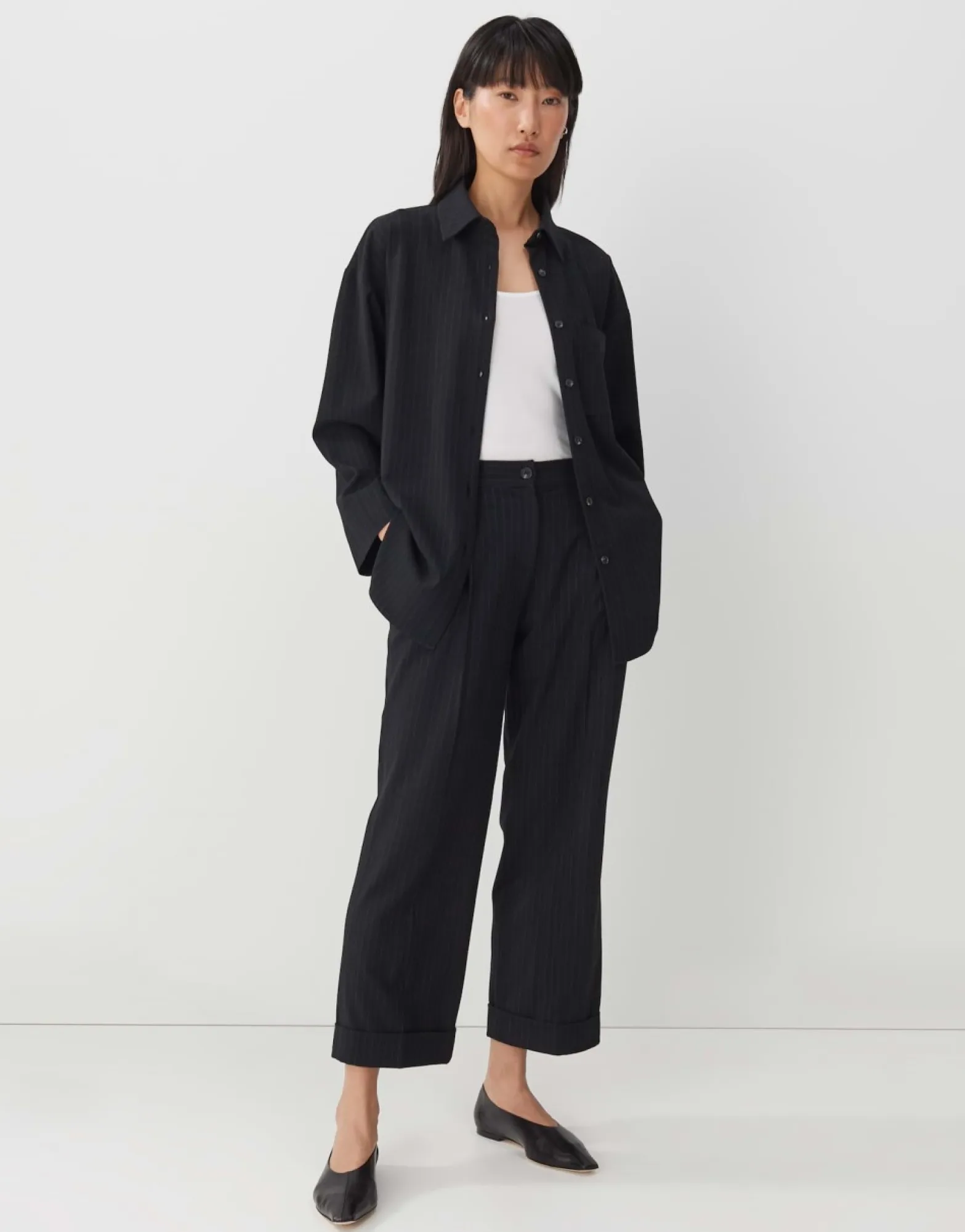 Deze Broek Van Zachte Stof Heeft Een Wijde, Rechte Pijp En Een Verkorte Lengte Met Een Beenplooi. De Krijtstreep Rekt Het Been Optisch Uit En Belooft Een Klassieke Zakelijke Look.
