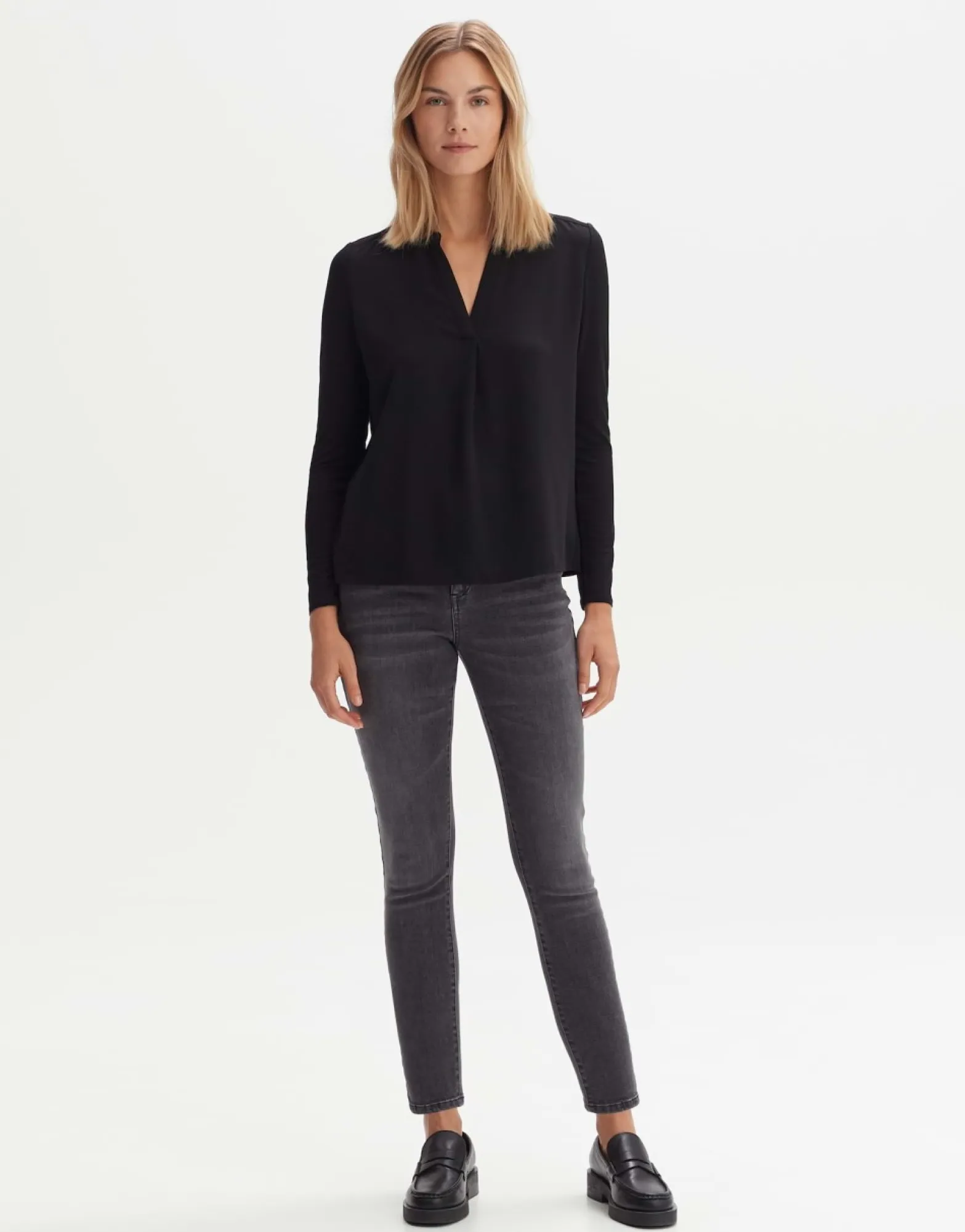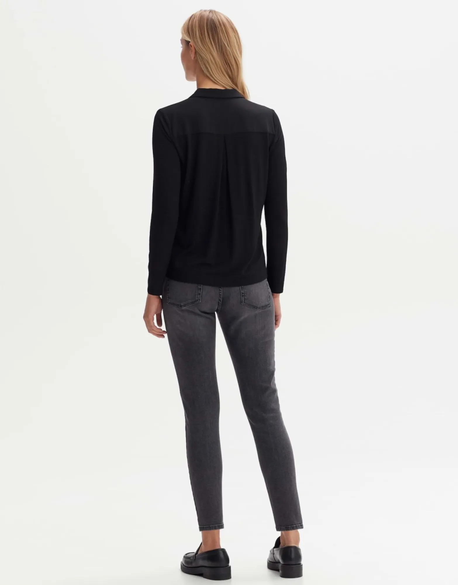 De Blouse Van Een Spannende Materiaalmix Is Aan De Voorkant Geweven In Een Chiffon Stof En De Achterkant En Mouwen Van Zachte Jersey. Om Soepel Te Vallen Loopt De V-Hals Onder De Kraag Over In Een Plooi.