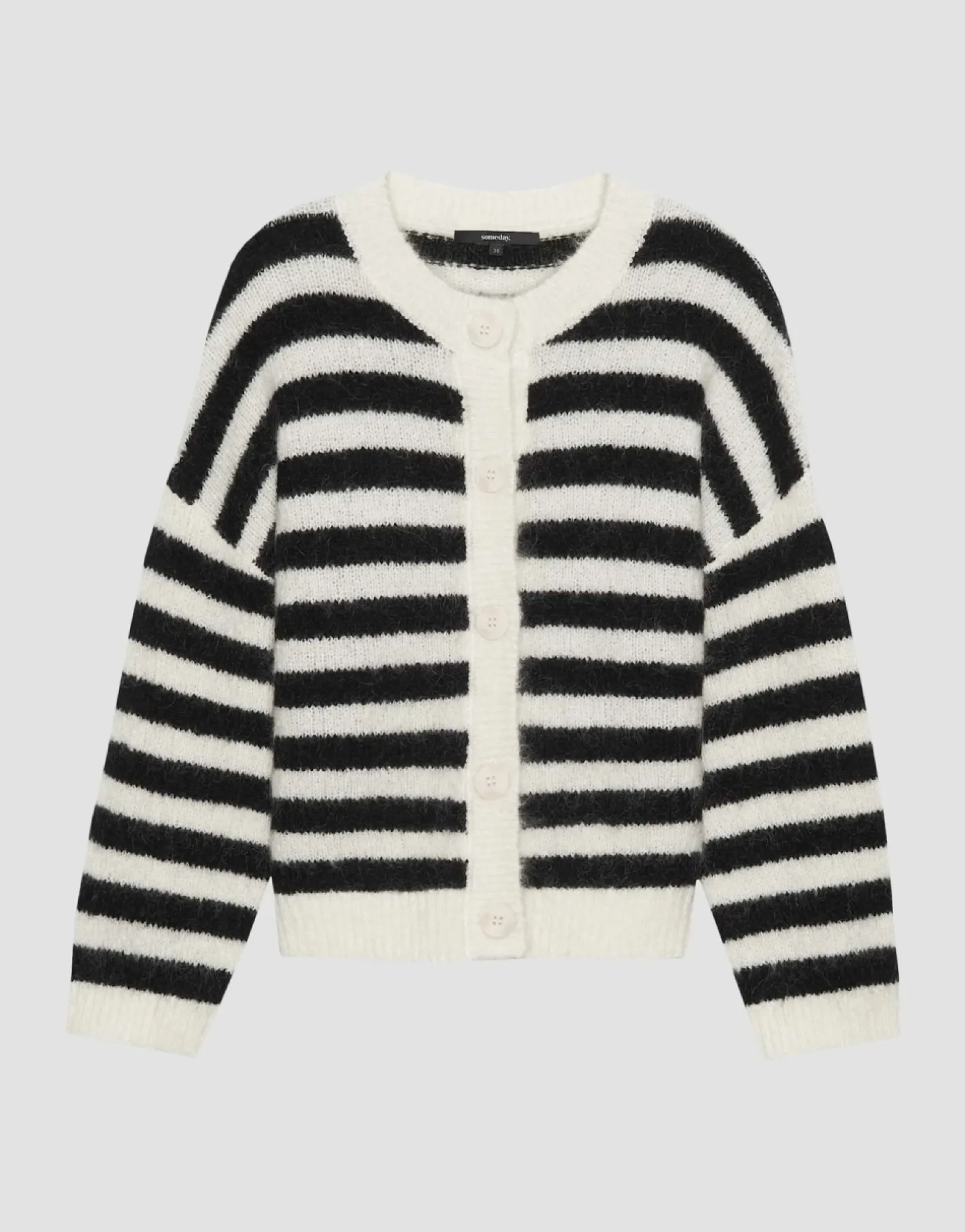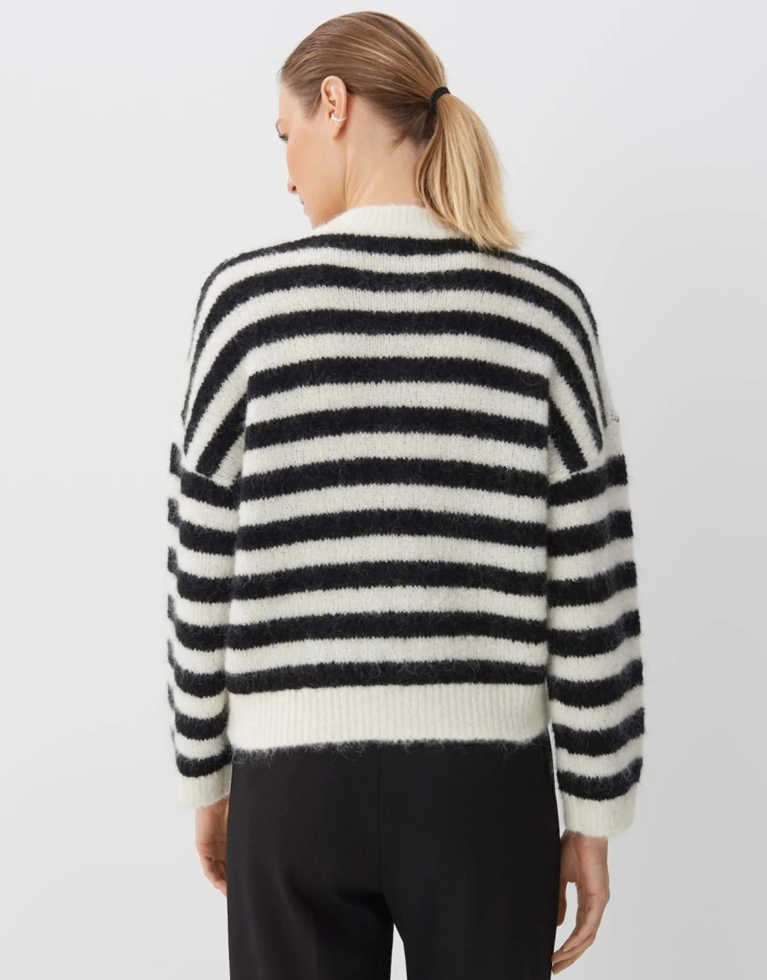 Dit Vest Is Gemaakt Van Een Pluizige Mohairmix En Speelt Met Een Klassieke Streep Over Een Winterse Stof. De Overgesneden Mouwen Geven Het Vest Een Nonchalante Pasvorm En Breken De Richting Van De Strepen.