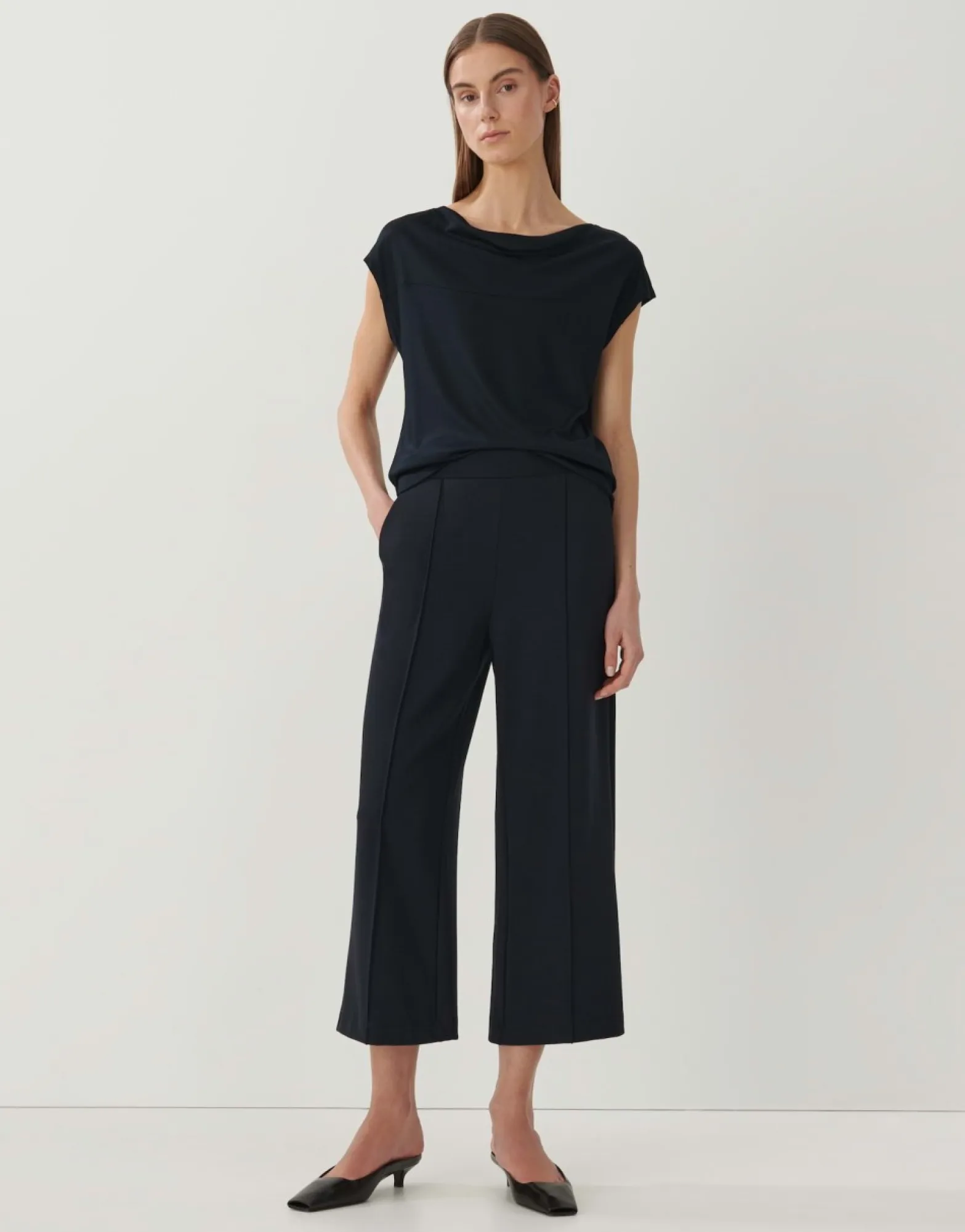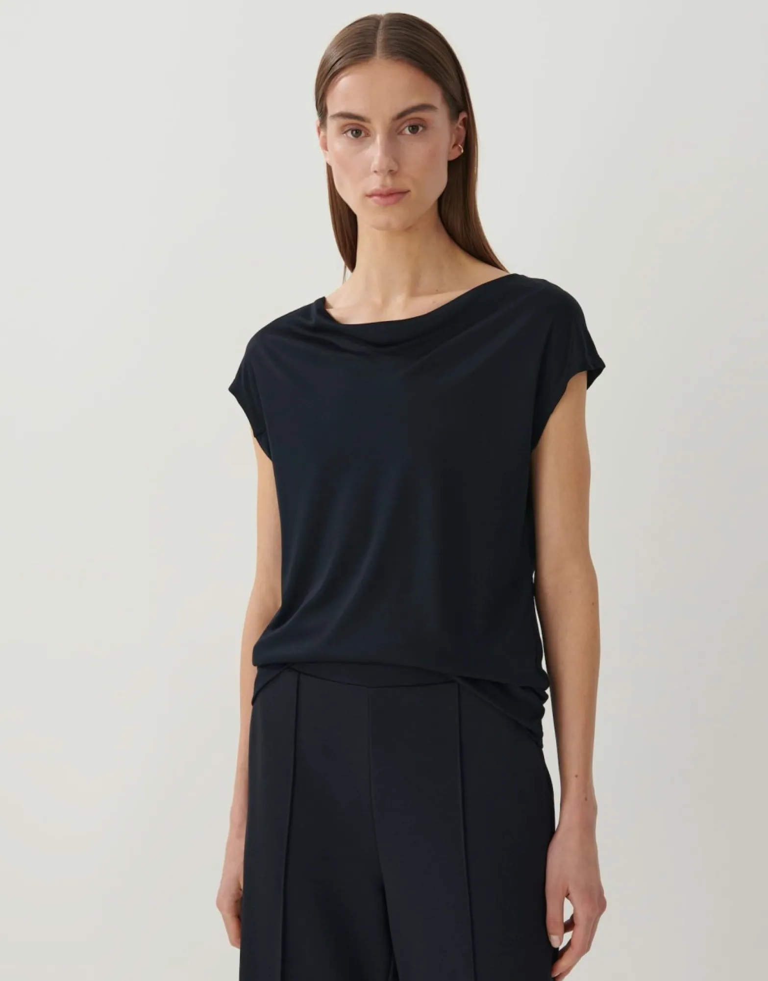 Het Shirt Van Ecovero™ Viscose Heeft Een Vrouwelijke Watervalhals. Een Horizontale Naad Op De Borst Breekt De Pure Look Van Het Shirt.