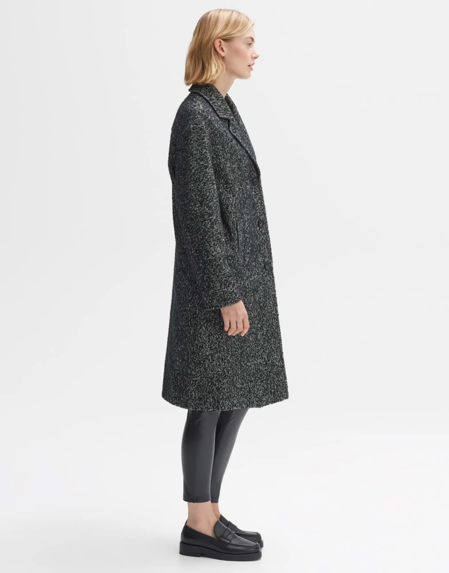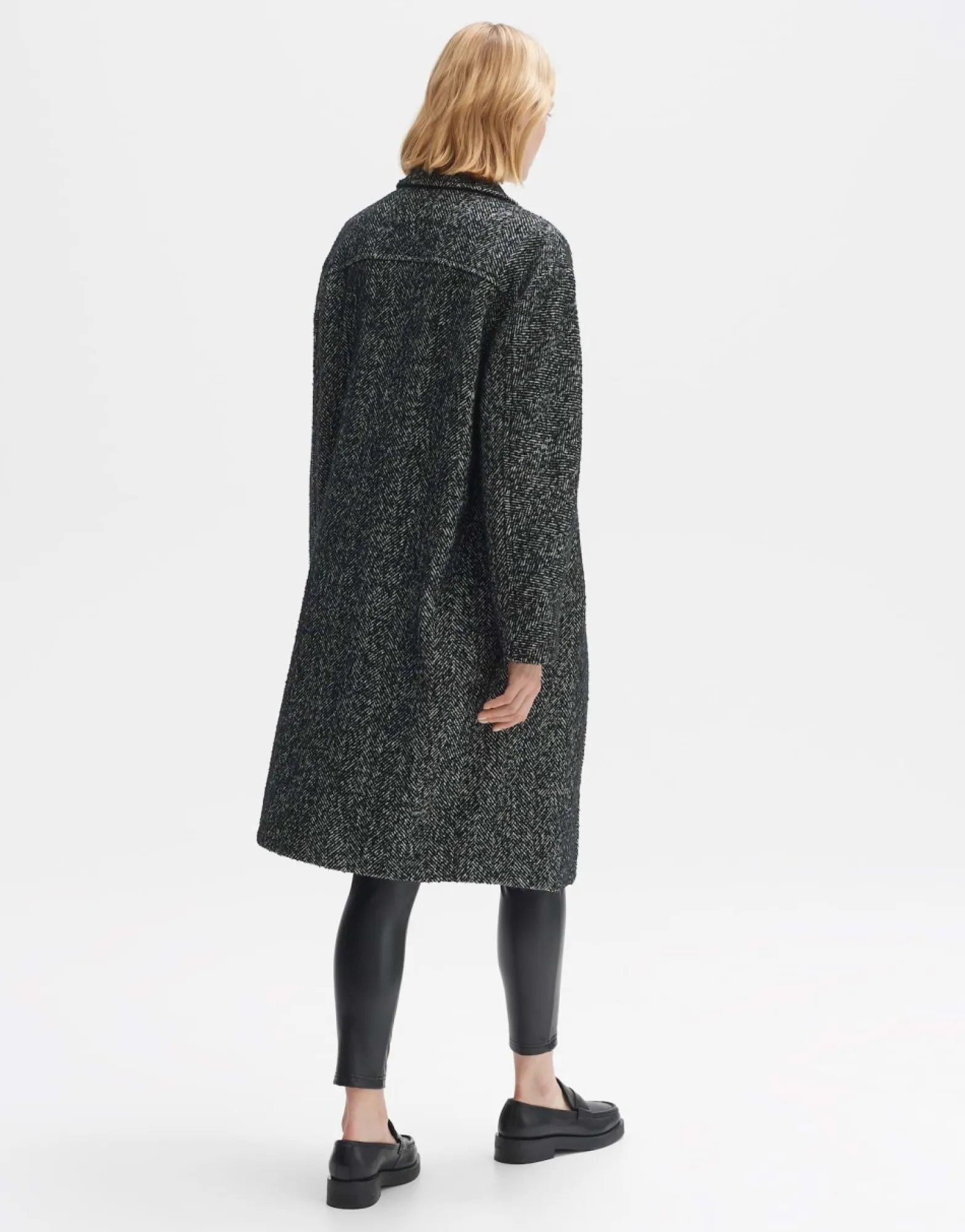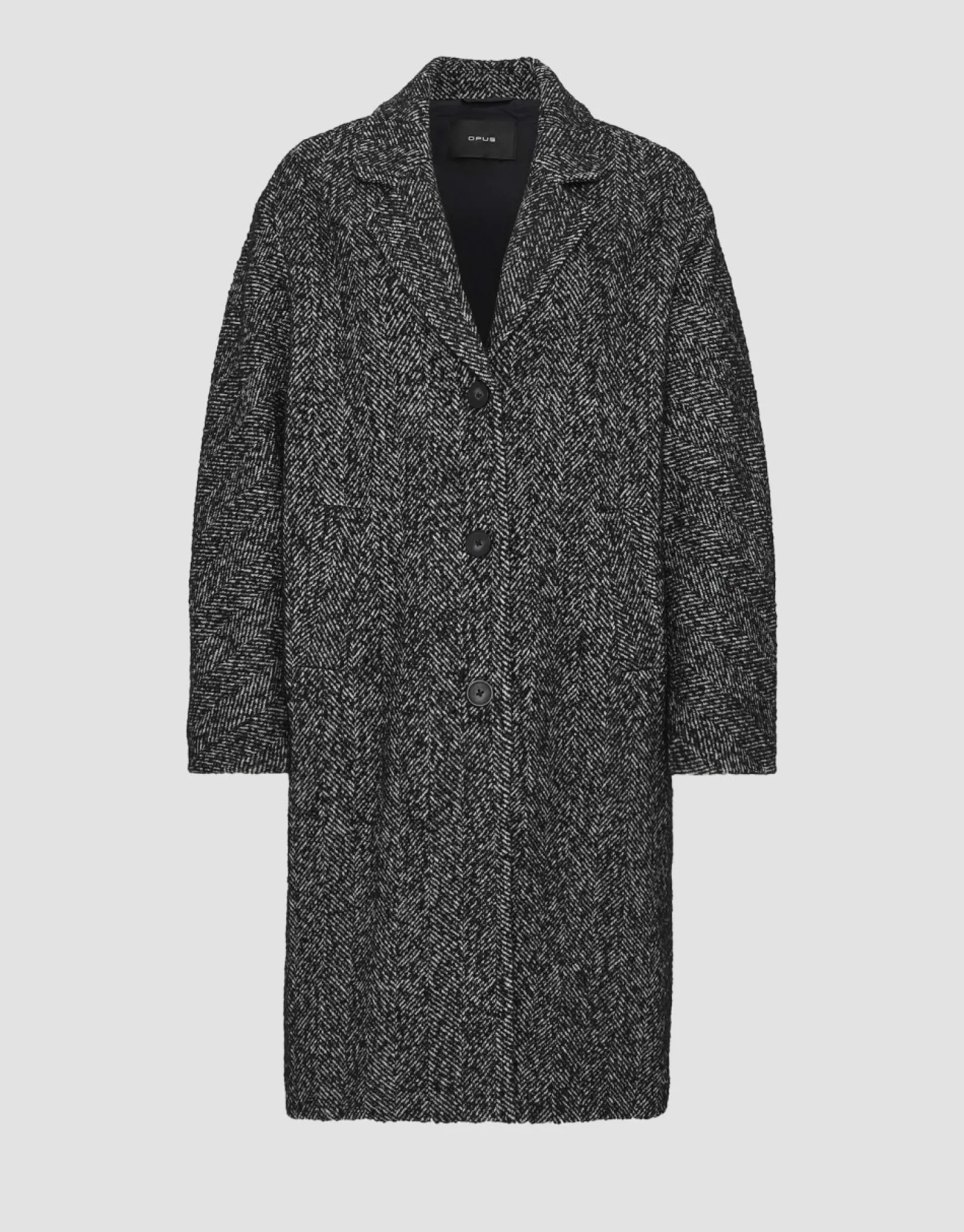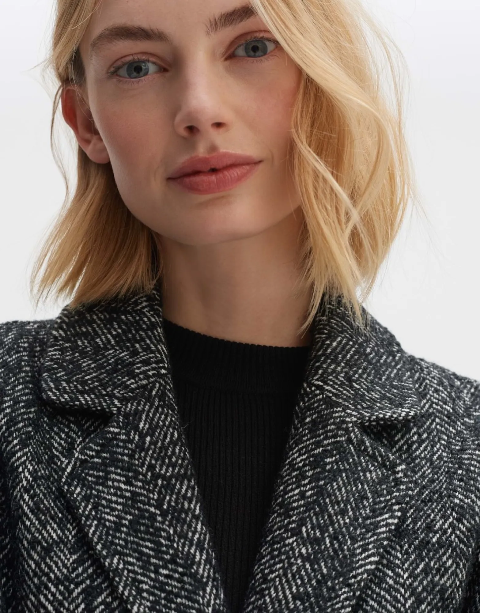 De Wollen Jas Heeft Een Mooie, Verwarmende Kwaliteit En Wordt Geleverd In Een Klassiek Visgraatpatroon. Het Nieuwe O-Vormige Silhouet Loopt Taps Toe Naar De Zoom Voor Een Sportieve, Elegante Look.