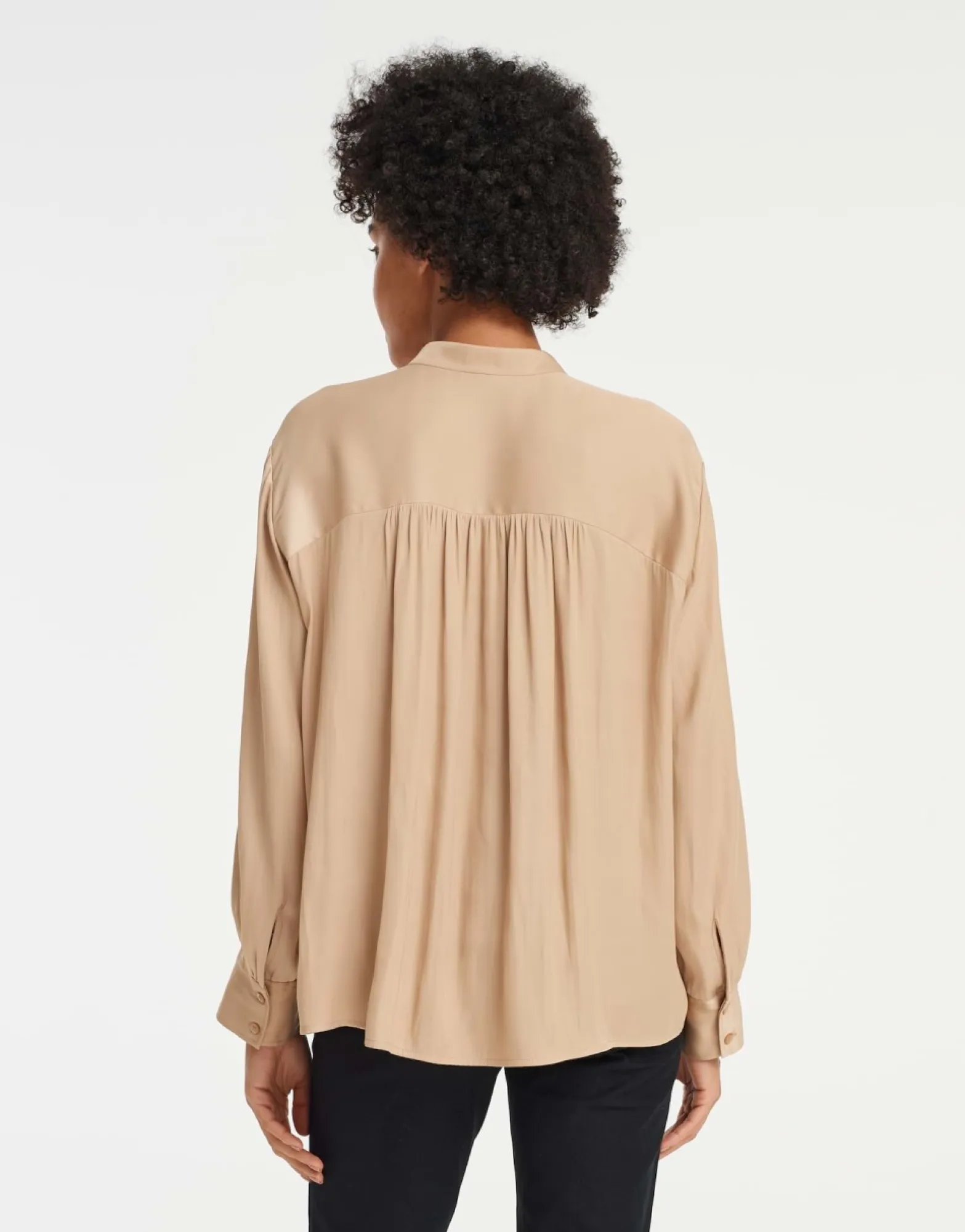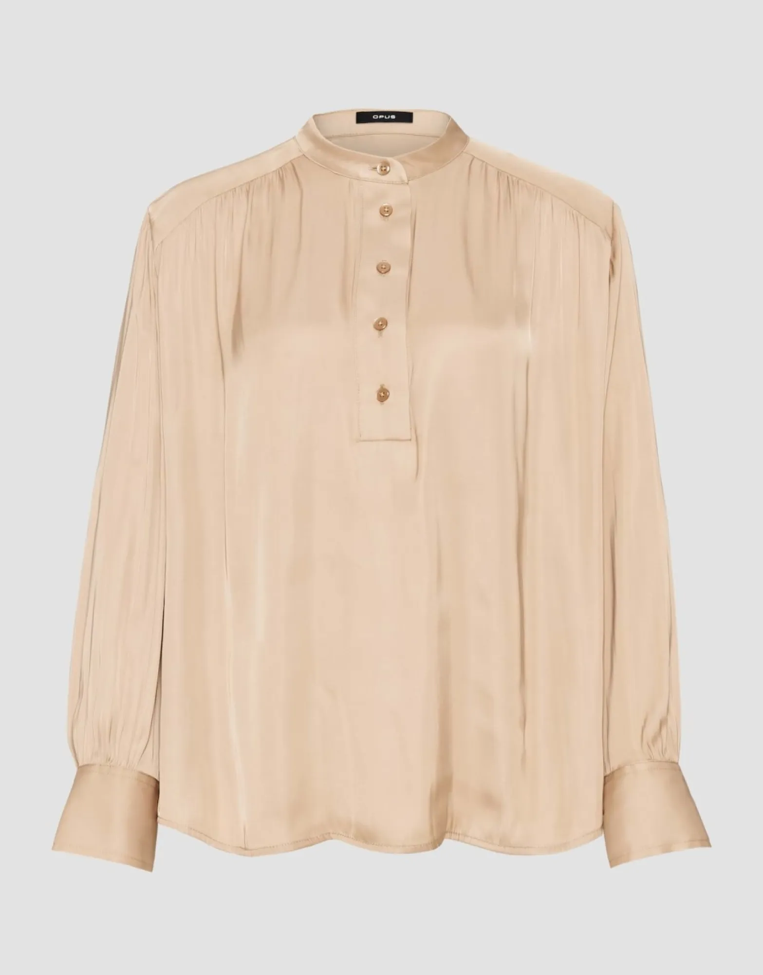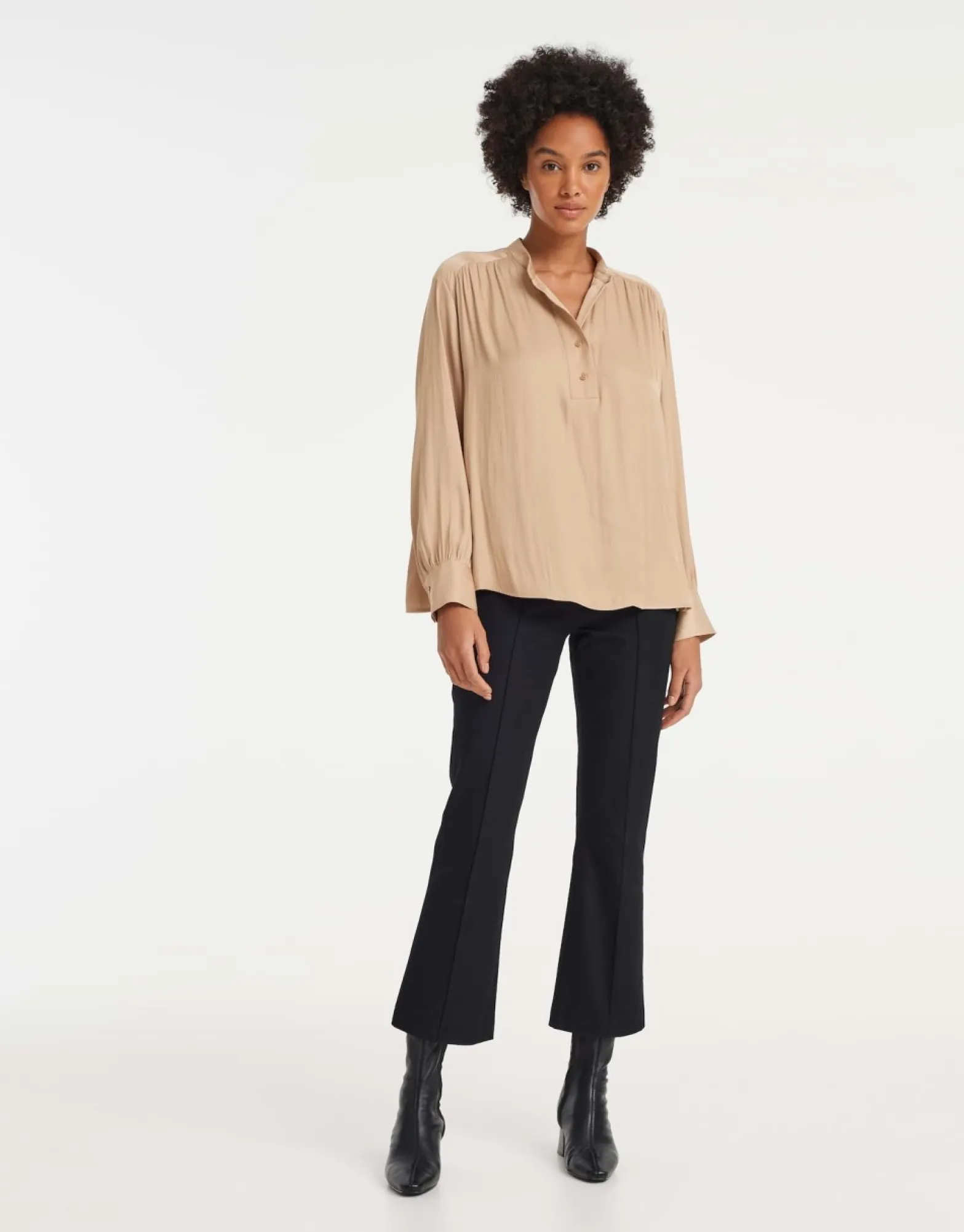 Deze Blouse Van Glinsterende Satijnstof Is Een Feestelijk Hoogtepunt. De Delicaat Vloeiende Stof Komt Het Best Tot Zijn Recht Door Het Wijde Silhouet En De Kleine Ruches Onder De Schouder.