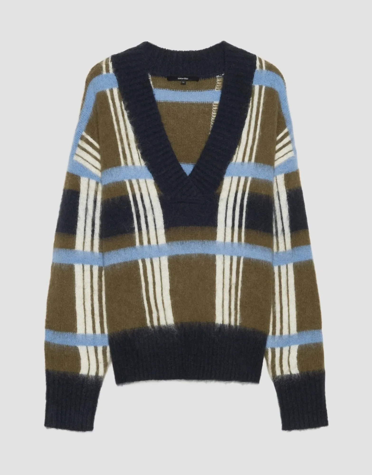 De Gebreide Trui Van Een Pluizige Wolmix Komt Tot Leven Met Een Royaal Ruitpatroon En Tegelijkertijd Verfrissende Kleurblokkering. De Monochrome Geribde Boorden Vormen Een Omlijsting Voor Het Artistieke Patroon.