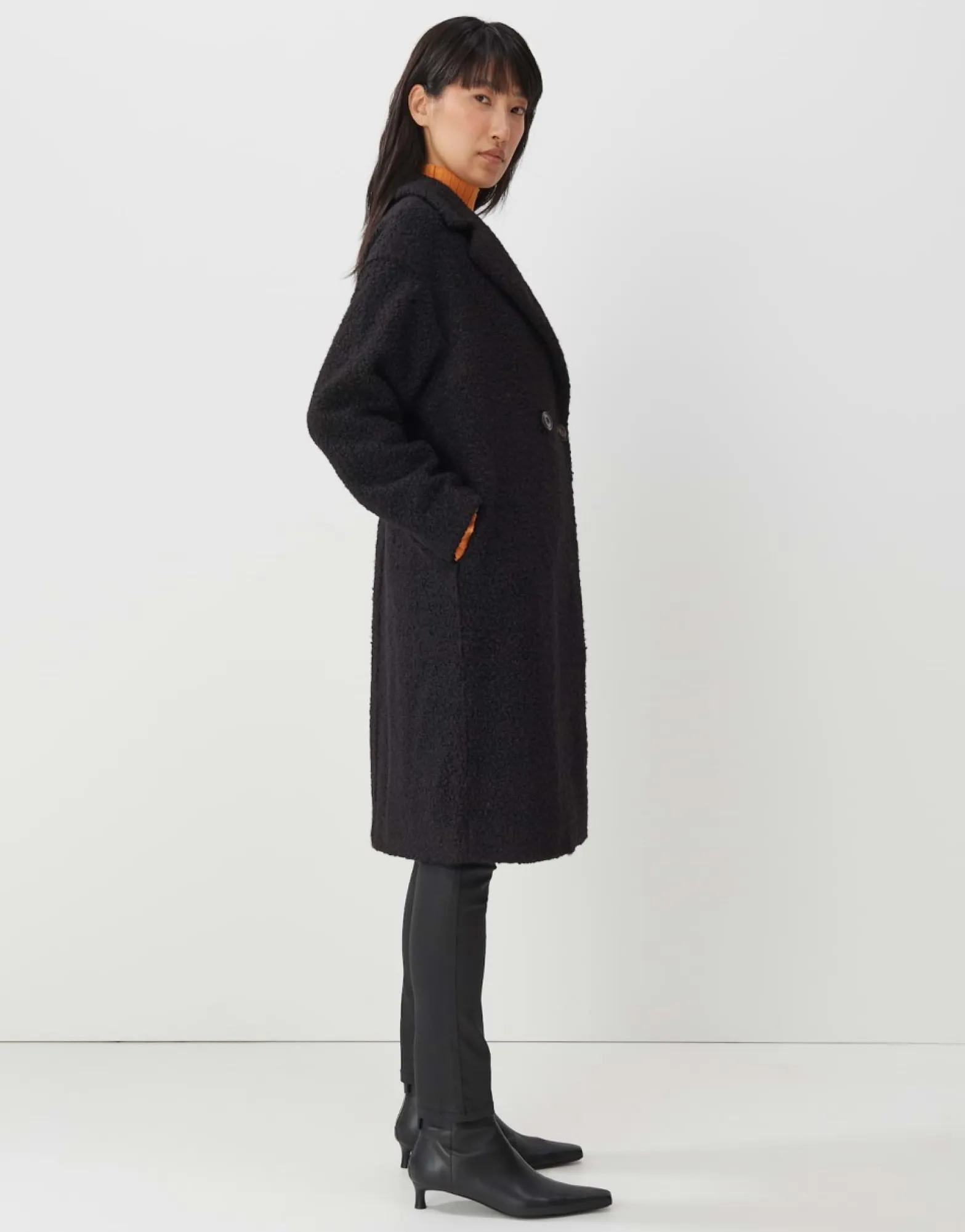 De Jas Is Gemaakt Van Een Zachte Viscosemix En Heeft Een Modieuze Imitatiebontlook. De Ruches Geven De Knielange Jas Een Dynamisch Oppervlak. Hij Kan Worden Gesloten Met Een Dubbele Rij Knopen.