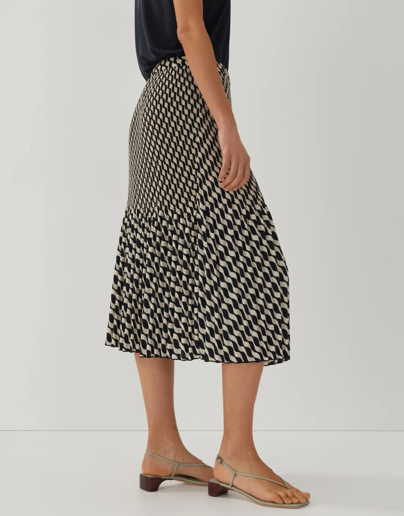 De Plooirok Van Gerecycled Polyester Speelt Met Een Mooie Print Over Kleine En Grote Plooien. Het Afwijkende Plooipatroon Maakt De Pasvorm Smal Tot Op De Knie En Vervolgens Uitlopend.