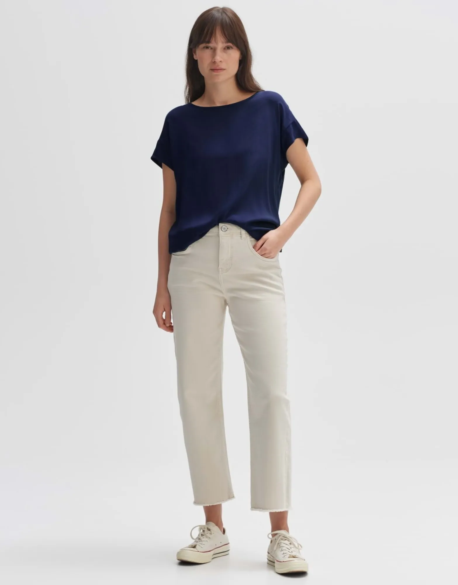 Dit T-Shirt Van Een Materiaalmix Van Ecovero™ Viscose Voelt Bijzonder Zacht Aan Op De Huid. Op De Rug Is Een Diep Schouderstuk Aangebracht. De Zoom Is Afgerond En Kan Los Over Een Broek Of Ingestopt Worden Gedragen.
