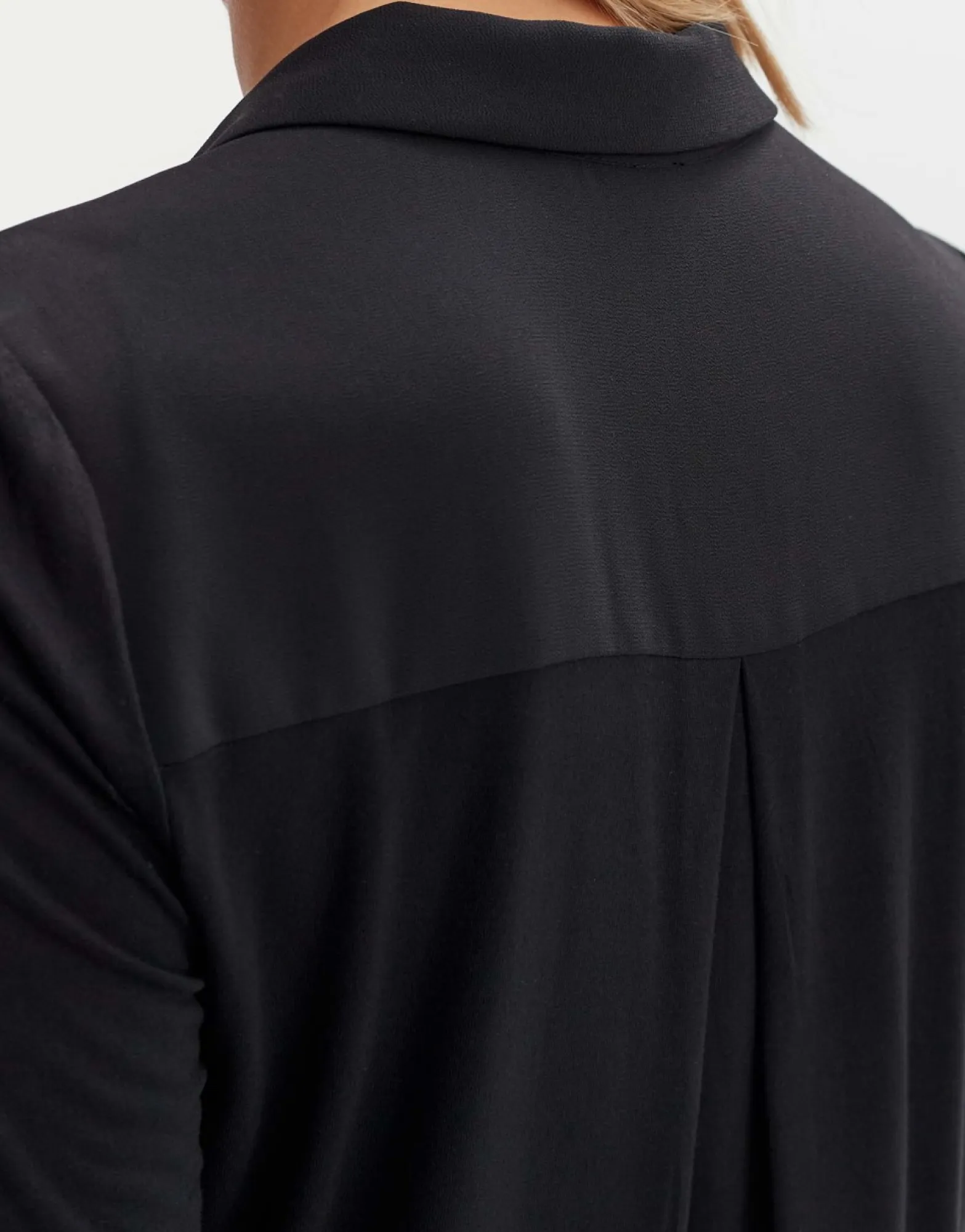 De Blouse Van Een Spannende Materiaalmix Is Aan De Voorkant Geweven In Een Chiffon Stof En De Achterkant En Mouwen Van Zachte Jersey. Om Soepel Te Vallen Loopt De V-Hals Onder De Kraag Over In Een Plooi.