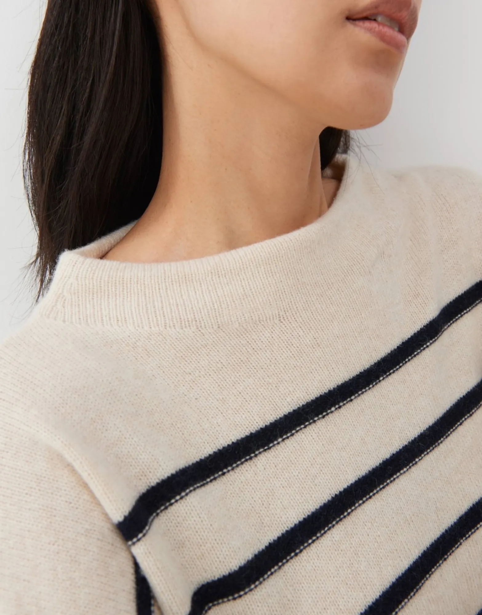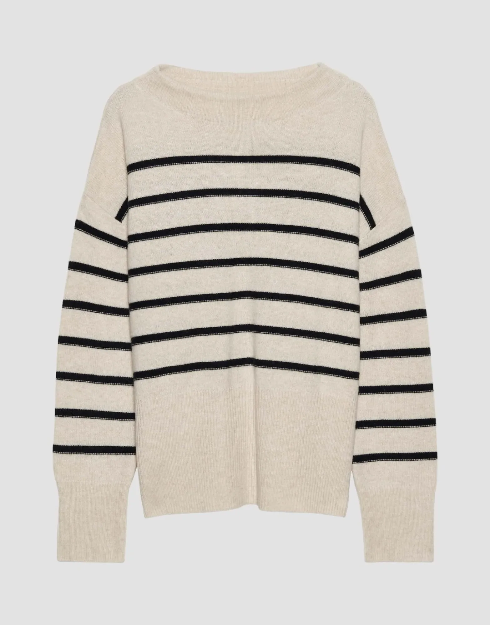 De Gebreide Trui Van Een Zachte Wolmix Heeft Een Prachtig Streeppatroon. Het Schouder- En Kraaggedeelte En De Zomen Zijn Monochroom Gehouden Voor Een Eenvoudig Contrast.
